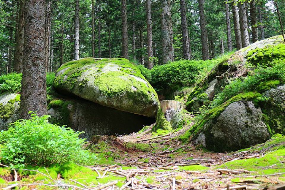 3. Augenstein. In direkter Nachbarschaft versteckt sich zwischen einigen Jungtannen ein riesiger Felsblock. Auf seiner Oberseite entdecken wir zwei fast auf einer Höhe nebeneinander liegende kreisrunde Schalen. Als hätte der Felsen seinen Blick gegen den Himmel gerichtet.