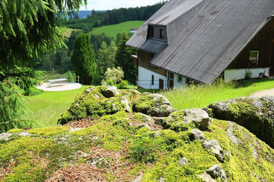 7. Wildsaustein. 300 Meter westlich vom Eulenstein ist der Holzeck erreicht. Der Asphaltstraße folgend stoßen wir zu einem der schönsten Aussichtspunkte um Schonach. In dieser aussichtsreichen Lage steht der Wildsaustein. Der Stein gleicht seinem namensgebenden Tier. Auf der Oberseite ist eine 65 cm große Schale mit breitem östlichen Auslauf zu finden. Dieser Stein dient auch als Grenzstein. In unmittelbarer Nähe am Waldrand lädt eine Sitzbank zum Rasten ein und bietet einen schönen Ausblick auf die Schwarzwaldlandschaft.