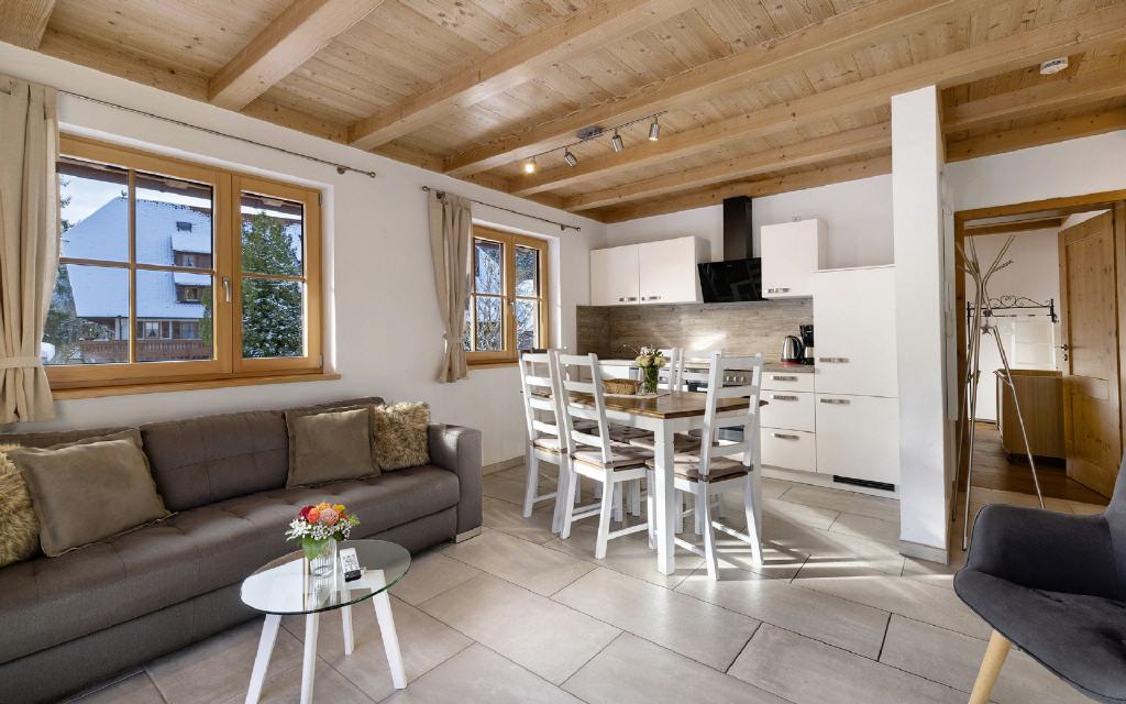 Ferienwohnung Flößerstuben: Separates Kinderzimmer, einen großen Wohn-Essraum mit Balkon und Küche, der nach oben hin zur Schlafgalerie offen ist, bei der sich auch das Badezimmer befindet. Größe ca. 80 qm. Preis 105 Euro (pro Nacht ab 4 Übernachtungen).