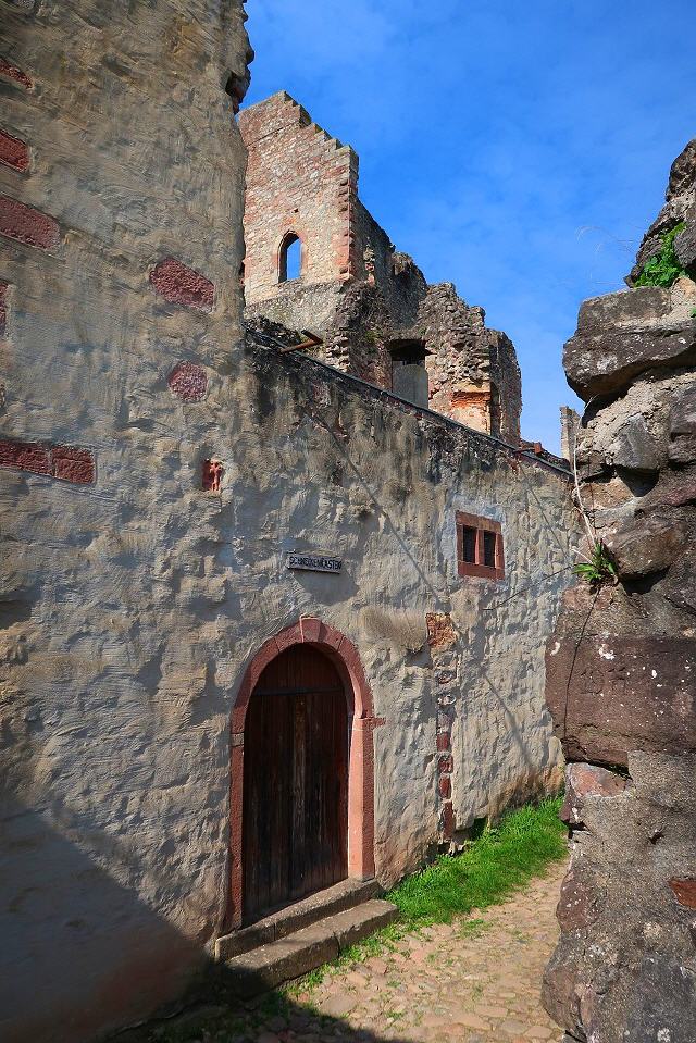 Nun sind es nur noch 450 m bis zur südlichen Bastion der Hochburg. Über eine Treppe und einen dunklen Mauerdurchgang kann man sie durchqueren. Beim Besuch der weitläufigen Anlage, die die zweitgrößte Burg Badens nach dem Heidelberger Schloss ist, empfiehlt es sich, auf die Färbungen der Mauerquader und auf die an vielen Stellen erschlossenen anstehenden Sandsteinschichten zu achten.