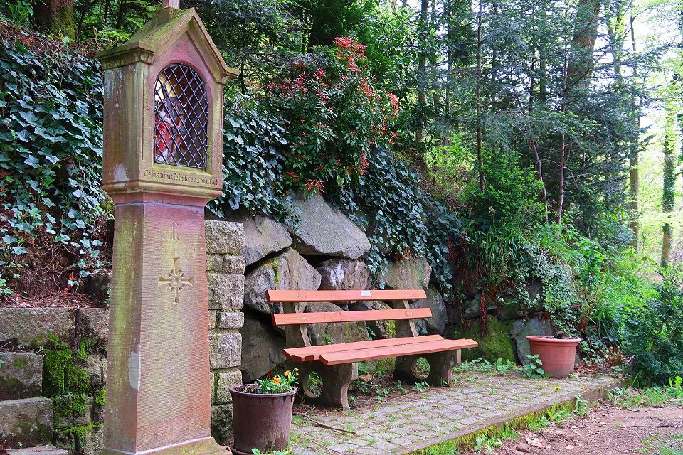 Bevor der Wald beginnt, kommt man an der Ecce-Homo-Kapelle vorbei mit der Figur des mit Dornen gekrönten Christus, geschaffen 1892 durch den Freiburger Berthold Knittel, erreicht dann den Barfußpfad mit einer Rastmöglichkeit, weiter geht es an der Balbinen-Kapelle vorbei zum Pirschweg bis zur Wassertretanlage. Hier ist auch Platz für eine Pause. Nun geht es am Waldrand entlang mit dem Blick über das Tal, an der Ölberggrotte vorbei, zurück zum Ausgangspunkt.