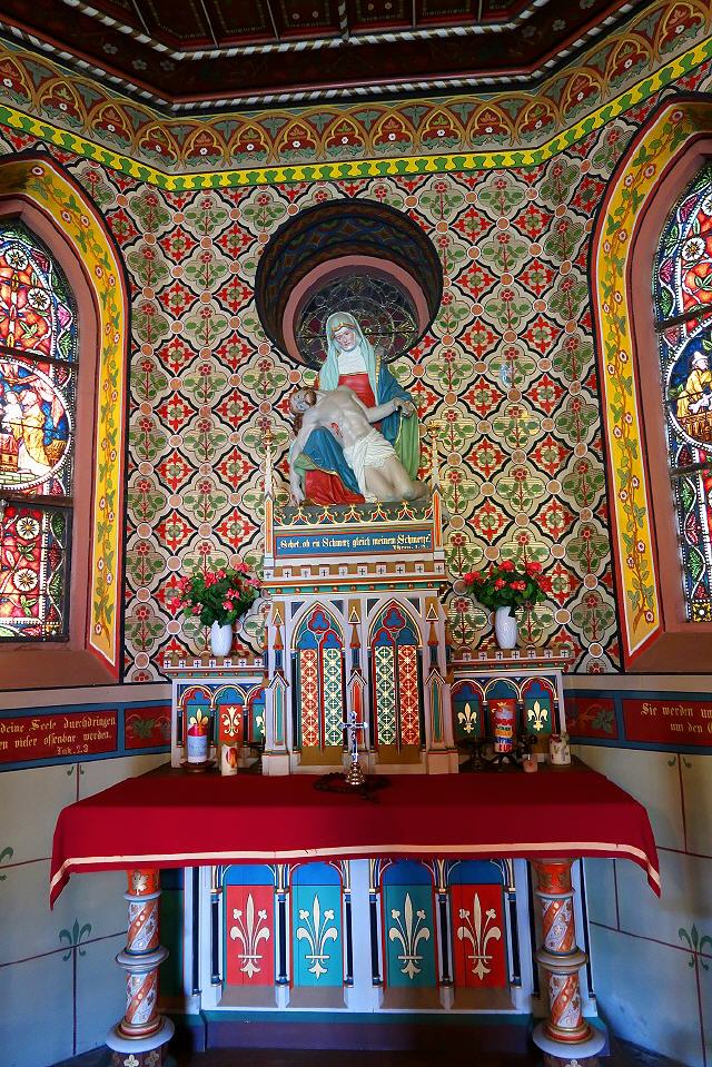 So markant die Kapelle über dem Dreisamtal und insbesondere am Eingang zum Wagensteigtal thront, so beeindruckend ist auch ihre Innenausstattung. Besonders auffallend sind die farbigen Glasfenster.