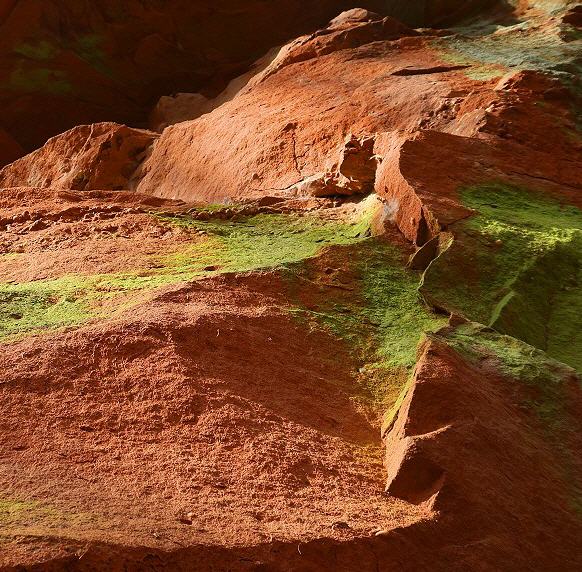 Der Pfad entlang der Steinbrüche stößt auf einen breiten Fußweg, dem man nach links durch steileres Gelände folgt. Sandsteinfelsen stehen am Weg an. Nach rund 250 m des enthalten sie größere gelbe Partien. Mit etwas Glück findet man hellgelbe verkieselte Sandsteine mit dünnen Schwerspatbelägen. 550 m weiter öffnet sich auf der linken Seite eine große und bis zum Kamm reichende Geländemulde. Felsnasen stehen hervor, ansonsten überwiegt Gesteinsschutt. So sieht ein gut 800 Jahre alter Steinbruch aus, der feuchten Klimabedingungen mit starkem Baumbewuchs ausgesetzt ist. Auffällig ist der nun gelbliche Sandstein. Dabei dürfte es sich um den wichtigsten Burgsteinbruch handeln, denn die Burg besteht ganz überwiegend aus gelblichem Sandsteinmauerwerk.