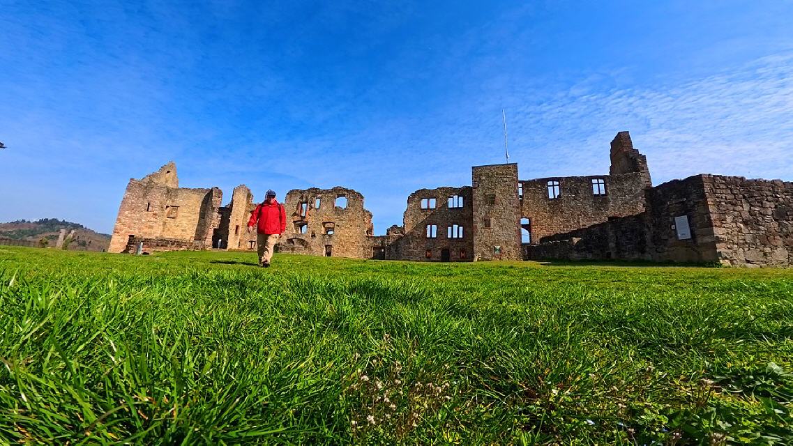 Nun sind es nur noch 450 m bis zur südlichen Bastion der Hochburg. Über eine Treppe und einen dunklen Mauerdurchgang kann man sie durchqueren. Beim Besuch der weitläufigen Anlage, die die zweitgrößte Burg Badens nach dem Heidelberger Schloss ist, empfiehlt es sich, auf die Färbungen der Mauerquader und auf die an vielen Stellen erschlossenen anstehenden Sandsteinschichten zu achten.