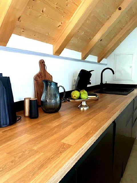 Zwei gemütliche Sessel mit Teetisch laden zum Entspannen ein. Ein Echtholz Hochtisch mit zwei drehbaren Hochstühlen eignen sich für Frühstück und Brotzeiten in privater Atmosphäre.