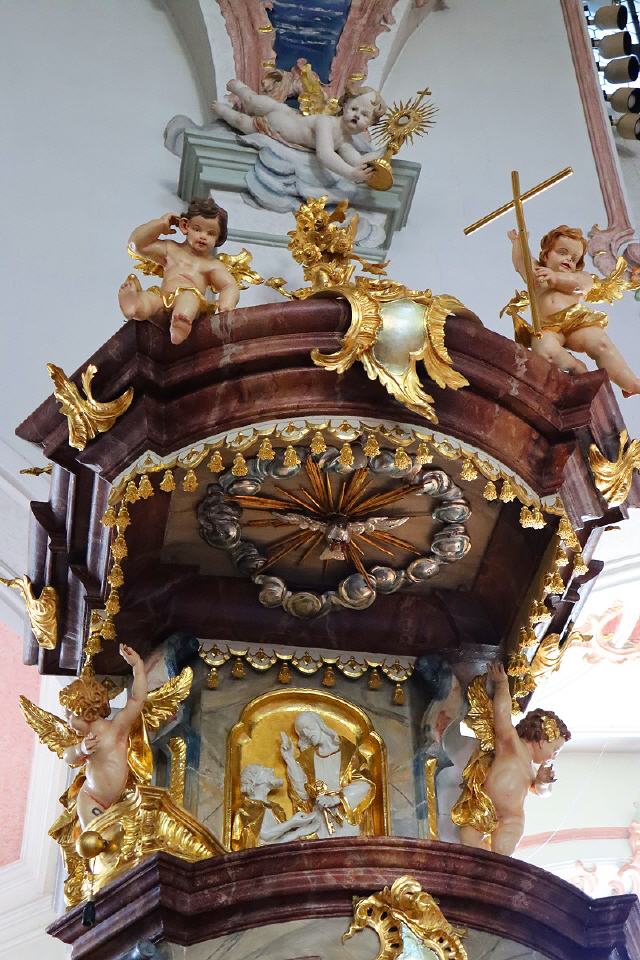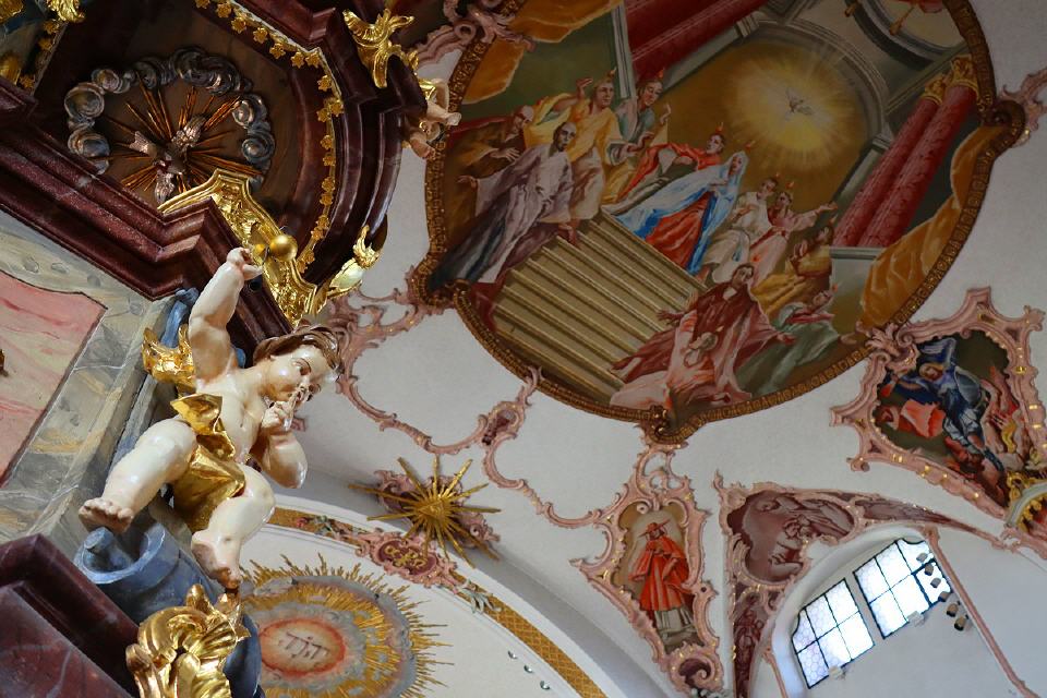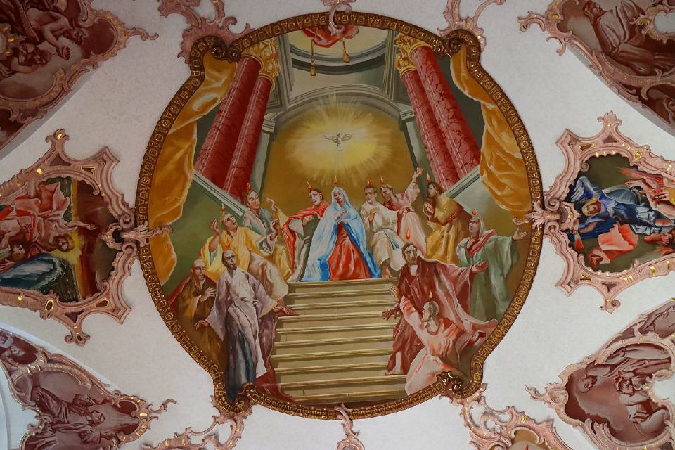 Hervorzuheben sind die Größe der Kirche, die weit über das üblich Maß einer Dorfkirche hinausgeht sowie die prunkvolle Innenausstattung. Die Deckengemälde wurden 1956/1957 von dem Maler Josef Braun aus Wangen im Allgäu geschaffen. Über der Orgelempore zeigt das erste Bild die Geburt Christi in einem zerfallenen Tempel. Diese Darstellung erinnert daran, dass mit Jesu Geburt eine neue Zeitepoche begonnen hat. Im zweiten Deckengemälde ist die Kreuzigung Jesu dargestellt. Unter den Trauernden – farbig hervorgehoben – sind seine Mutter Maria und der Lieblingsjünger Johannes sowie Maria Magdalena. Dargestellt wird auch der römische Hauptmann, von dem überliefert wird, er habe als erster den gekreuzigten Jesus als Sohn Gottes bekannt. Das dritte Deckengemälde stellt die Herabkunft des Heiligen Geistes auf Maria und die Jünger dar, das Pfingstfest. Zeichen für den Heiligen Geist sind die Taube und die züngelnden Flammen (Feuerzungen).