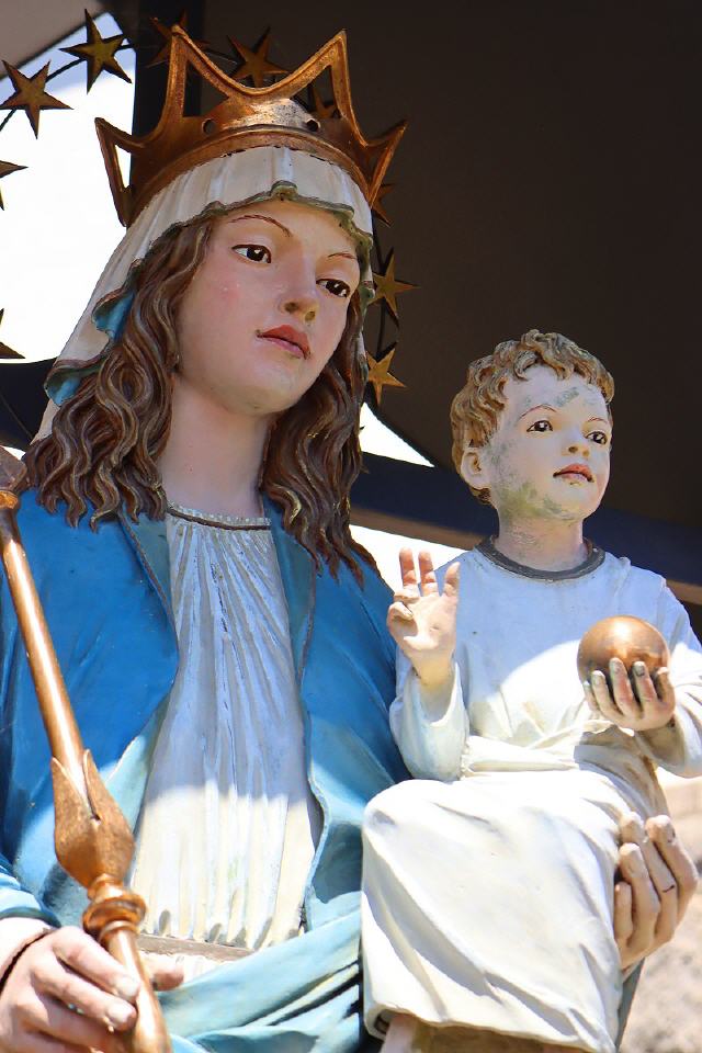 Im unteren Bereich des Hochaltarbildes ist eine kleine Kirche eingemalt. Vielleicht sah so eine der früheren Schonacher Kirchen aus. Das Hauptbild des Hochaltars zeigt die Aufnahme Mariens in den Himmel und ihre Krönung. Das Bild des linken Seitenaltars zeigt Maria, die Himmelskönigin, die dem heiligen Dominikus einen Rosenkranz reicht und erläutert. Das Bild des rechten Seitenaltars zeigt die heilige Anna und ihre Tochter Maria mit der Bibel in Händen.