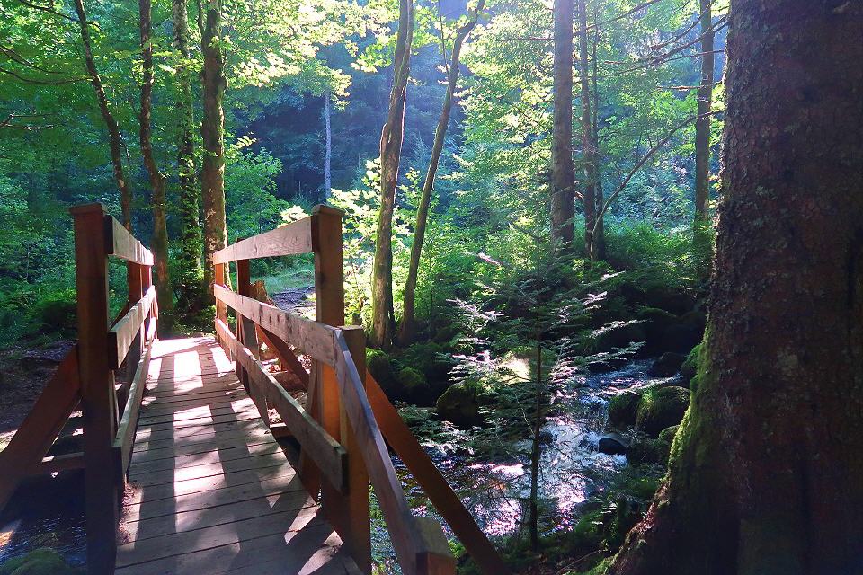 Vom Parkplatz Mühlebühlbrücke Rohrhardsberg an der L 109 (Elztal-Schonach) aus geht es nach wenigen Metern Elz-aufwärts über eine Holzbrücke über die Elz. Was hier als kleines Bächlein beginnt, begibt sich auf eine 121 km lange Reise bis zum Rhein.