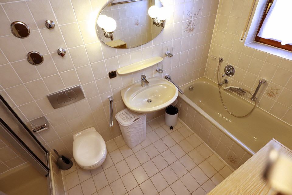 Das Bad ist frisch herausgeputzt. Mit einer eigenen Dusche, getrennter Badewanne und einer Waschmaschiene sowie einem WC erfüllt es alle Wünsche. Neben dem Badezimmer befindet sich ein weiteres WC.