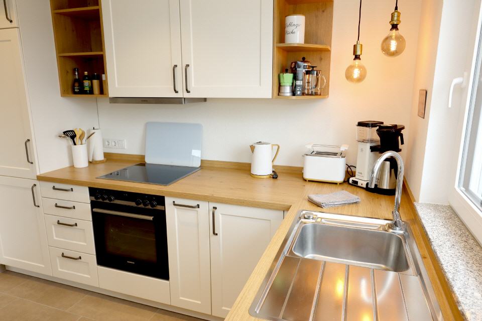 Voll ausgestattete Küche mit Ceranfeld, Backofen, Spülmaschine, Kühlschrank, Kaffeemaschine, Espressokocher und weiteren Extras