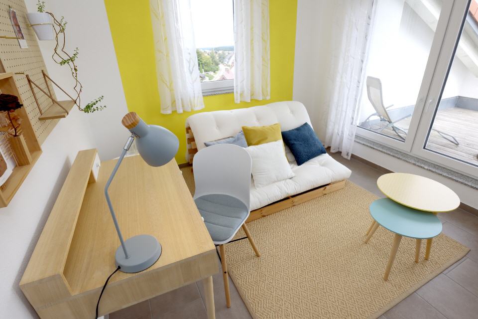 Stockwerk mit extra Zimmer, Bad mit Badewanne, Sofa und Dachterrasse
