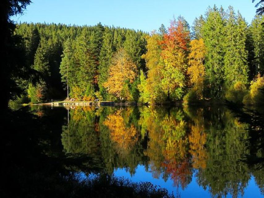 Wir folgen dem Pfad und biegen im Stuckwald links ab, hinunter zum geheimnisvollen Mathisleweiher, dessen Ufer teilweise unter Naturschutz stehen und genießen diese Idylle. Wir schlendern linksseitig am See entlang und halten uns in Richtung Oberzarten / Dreiwege. Am Mathislehof mit eigenem Bauernhofladen vorbei biegen wir rechts ab zur Dorneck / Helmelwald.