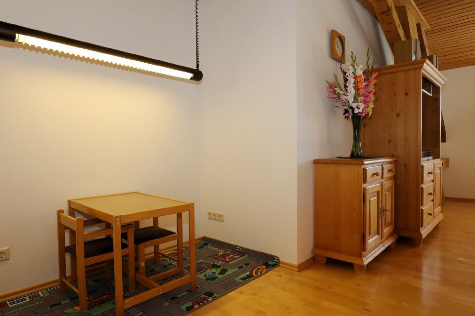 • Wohnzimmer: geräumiges, großes Wohnzimmer, gemütliche Sitzecke / Couch, Sessel, Tisch, Kommoden, Sat-TV, Spielecke mit Tisch und Hocker