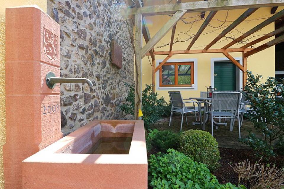 Der begrünte Innenhof mit Freisitz unter einer Weinreben-Pergola mit einem Brunnen und mit einer markanten Trockenmauer bieten Ruhe und Erholung.