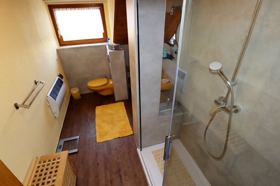 • Das Badezimmer ist groß und verfügt über eine geräumige Dusche mit Glasabtrennung. Selbstverständlich sind Waschbecken sowie WC da.