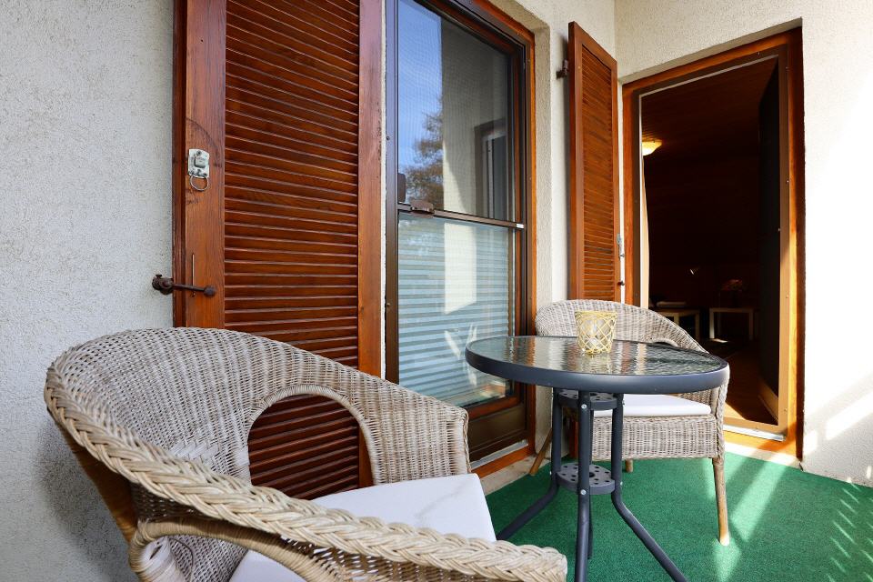 • Das Schlafzimmer hat ein Doppelbett, einen Tisch mit 2 Stühlen. Direkter Zugang zum Balkon Ost. Kinderbett für Kleinkind auf Anfrage.