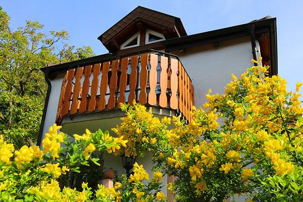 Das Gästehaus liegt in ruhiger, sonniger Halb-Höhenlage, direkt am Golfplatz zwischen der Wasserstretanlage und dem Aussichtspunkt bei der Kapelle “Maria Hügel”. Vermietet werden 2 große Ferienwohnungen für je 2 bis 4 Gäste. Und 4 kleine, preiswerte Ferienappartements für je 1 bis 2 Personen. Alle Ferienwohnungen und Apartments haben einen Balkon oder eine Terrasse. Bild antippen!