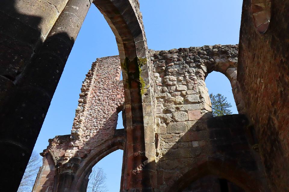 Nach dem Tod Utas scheint der Bau des Stifts nur langsam vorangekommen zu sein und teilweise auch über längere Zeit geruht zu haben. Die ältesten noch erhaltenen Bauteile der Ruine der Klosterkirche aus lokalem Buntsandstein werden auf Anfang bis Mitte des 13. Jahrhunderts datiert und sind stilistisch der Straßburger Bauhütte zuzuordnen. An der Ruine des kreuzförmigen Kirchenbaus sind noch Stilmerkmale aller Bauphasen des Kirchengebäudes von Spätromanik bis zur Spätgotik zu erkennen. Der Westteil des Gebäudes bestand aus einem dreischiffigen spätgotischen Langhaus mit spätromanischer Fassade im Eingangsbereich. Der wie die Querschiffe viereckig ausgeführte Chor der Ruine weist frühgotische Stilelemente in den Kapitellen und den Gewölberippen auf, die auf einen Zeitraum von circa 1220 bis 1250 datiert werden und damit zu den ältesten bekannten gotischen Bauformen am Oberrhein zählen. Die rechteckige Vierung war von einem Turm bekrönt. Der Kapellenanbau am südlichen Querschiff ist äußerlich noch erhalten und weist im Innern das vollständige sechsteilige Gewölbe mit Schlussstein auf, dieser weist Ähnlichkeiten mit dem Patronatswappen des Stifts Allerheiligen auf.