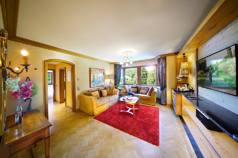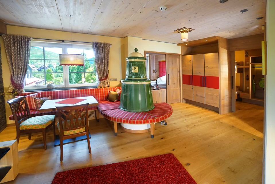 Die großzügigen Familienzimmer haben separate Kinderzimmer, eigenen Kachelofen, Natursteinwände und Massivholzboden. Im Haus gibt es einen Fitnessraum, Wellness Bereich und Sauna. Hier werden Sie sich sofort zuhause fühlen.
