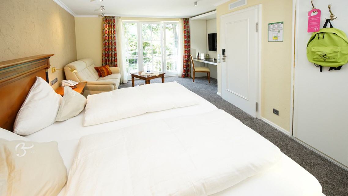 Bienengarten 1.0 (Komfortzimmer): Im „Bienengarten“ werden Sie sich besonders wohlfühlen: Das moderne Ambiente nimmt Zitate traditioneller Schwarzwaldelemente auf - natürlich sind die Materialien: Naturstein, echter Massivholz Parkettboden, warme, gedeckte Farben und fein abgestufte Lichtstimmungen. Hier fühlen Sie sich ganz geborgen und doch mitten in der Natur. Sensationell sind die großen Fenster mit bester Aussicht in die Rebenlandschaft, auf die bewaldeten Bergrücken und in unseren blühenden Hotelpark. Auf Sie warten ein großes Doppelschlafzimmer mit Französischer Logia, eine stilvoll- gemütliche Sitzecke, ein Schreibtisch und ein großer LCD-Fernseher. Obligatorisch stehen Ihnen Telefon und ein kostenloser W-LAN Internetzugang zur Verfügung. Die Bäder sind mit Kosmetikspiegel, Dusche, Haar Föhn, Radio und WC ausgestattet. Diese Komfortzimmer sind Allergiker Zimmer - Haustiere sind daher hier leider nicht möglich. Preis ab 95 Euro pro Person
