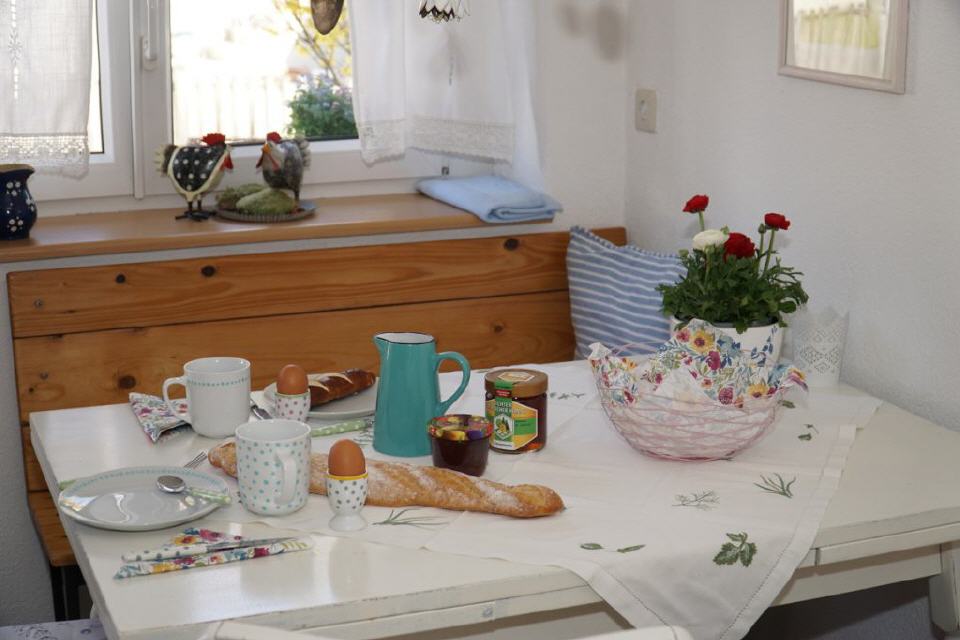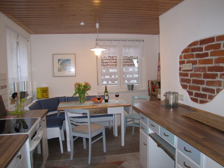 Voll ausgestattete Küche mit Elektroherd (Cerankochfeld), Backofen, Dunstabzug, Kühlschrank, Toaster, Kaffeemaschine, Wasserkocher, Spülmaschine, ausreichend Geschirr und Besteck für 4 Personen und gemütlichem Essbereich.